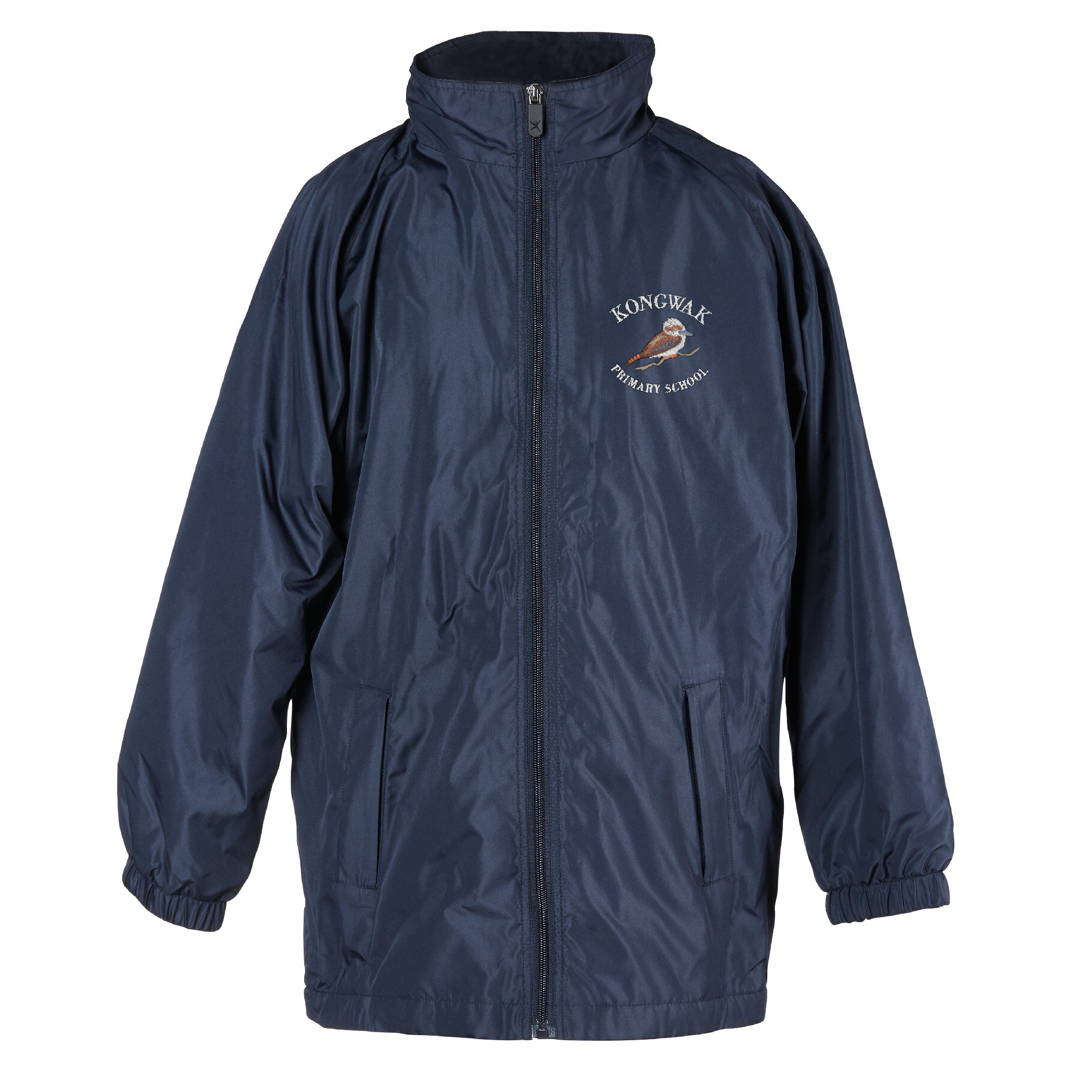 Polar fleece lined rain jacket with two front pockets and concealed hood in the collar.