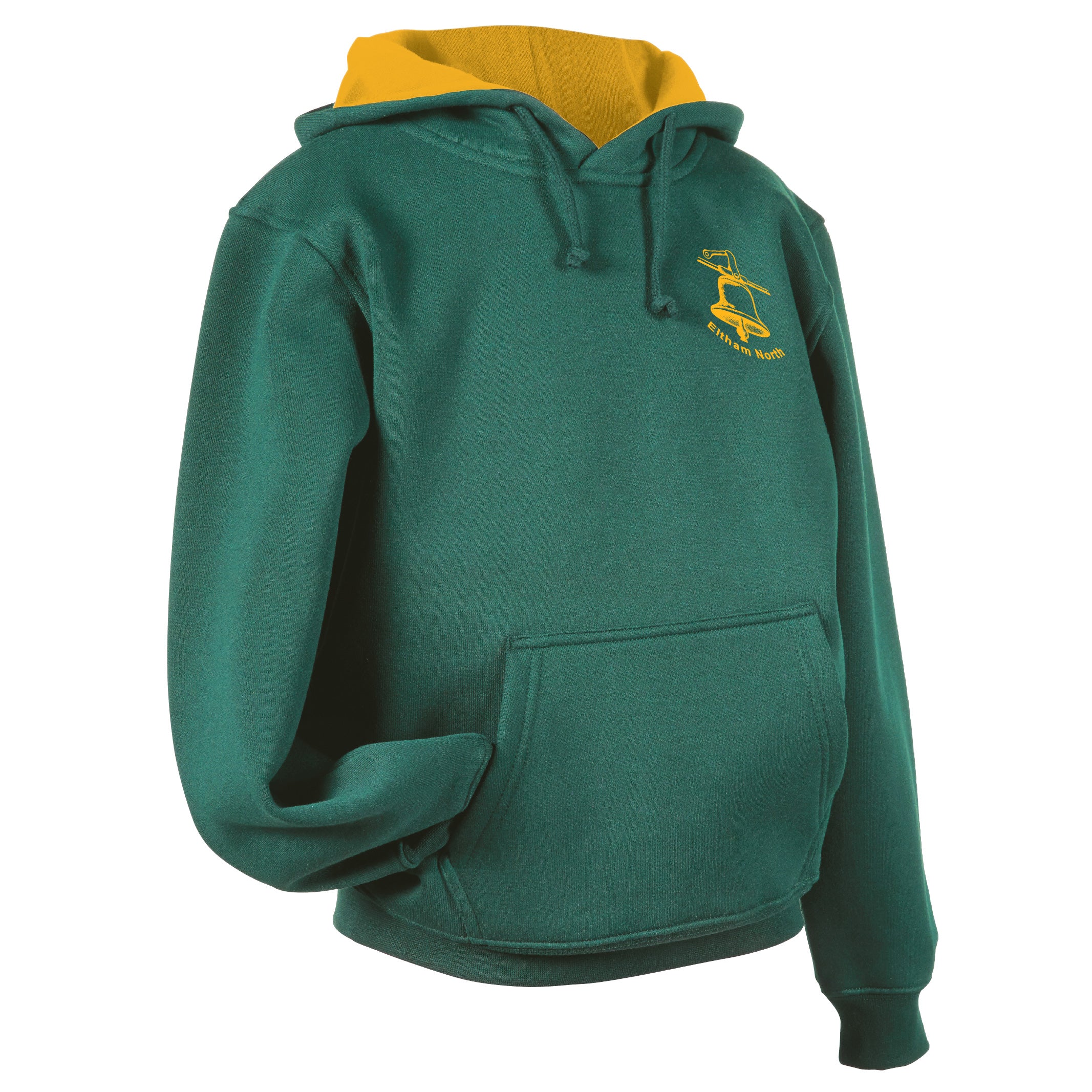 Poly cotton soft fleecy hoodie, dark bottle with matching ribbed cuffs and waistband. Featuring a gold lining drawstring hood and large pouch pocket to keep warm with Eltham North Primary School on front left.