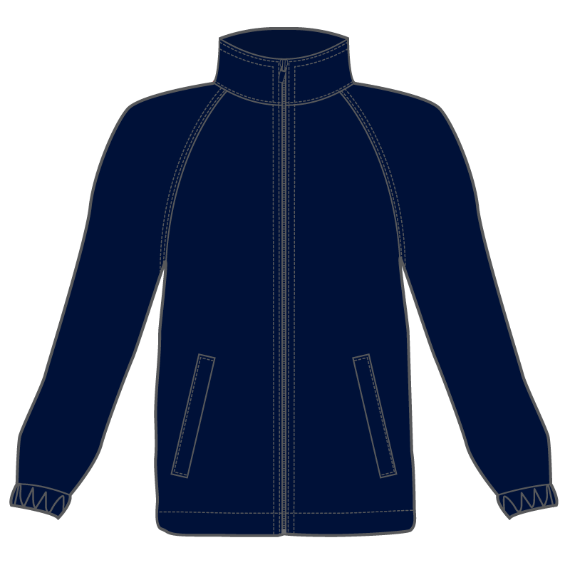 Water resistant zip- up jacket with polar fleece lining. Raglan sleeves, 2 front zip pockets and hide away hood in back collar.
