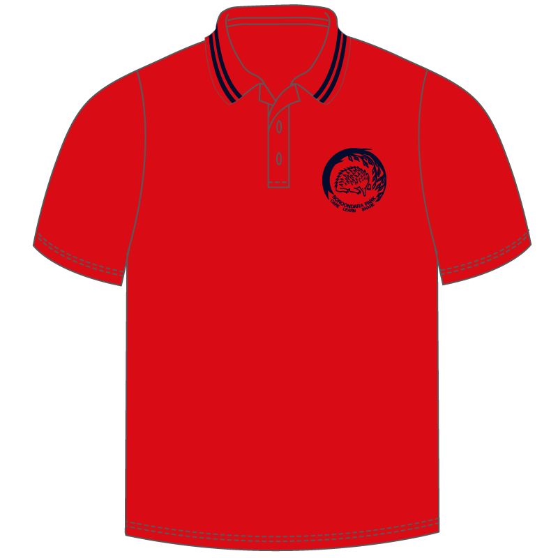 Short sleeve polo with Boroondara Park Primary logo. Red with ink navy trim.
