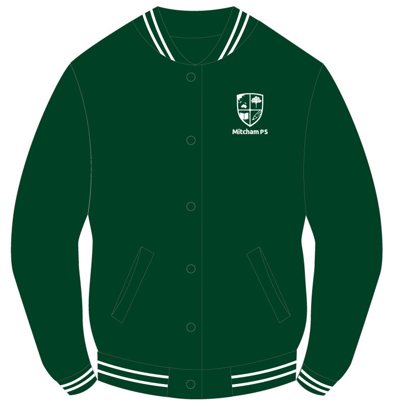 Fleecy bomber jacket, bottle green with white trim featuring Mitcham Primary School logo.
