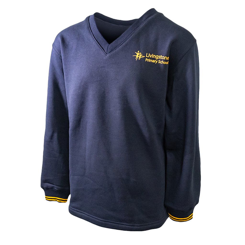 Fleecy V Neck windcheater, navy with gold trim and Livingstone Primary School logo.