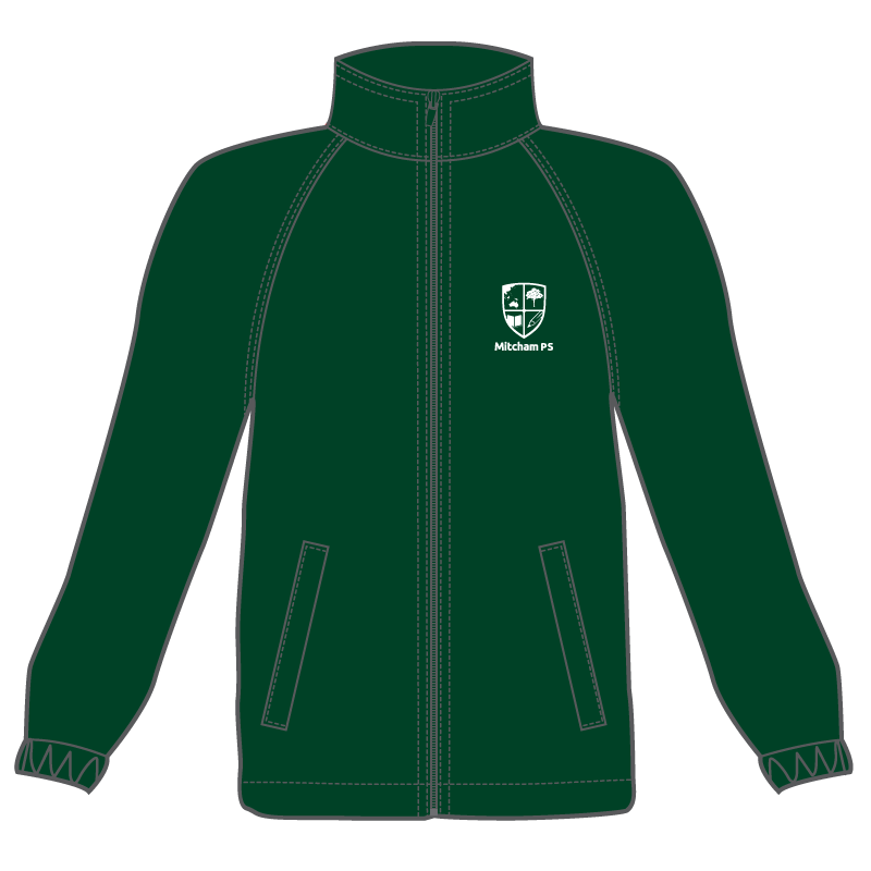 Polyester water resistant zip-up jacket with fully lined polar fleece in bottle with white Mitcham Primary School logo.